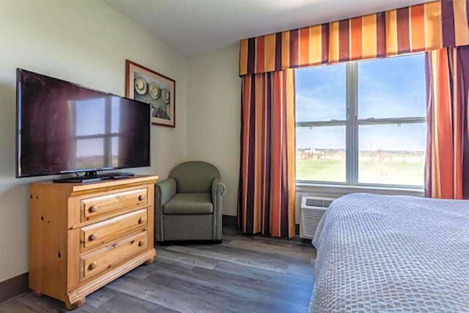This suite includes a microwave, refrigerator and seating area with a sofa bed and a cable TV.